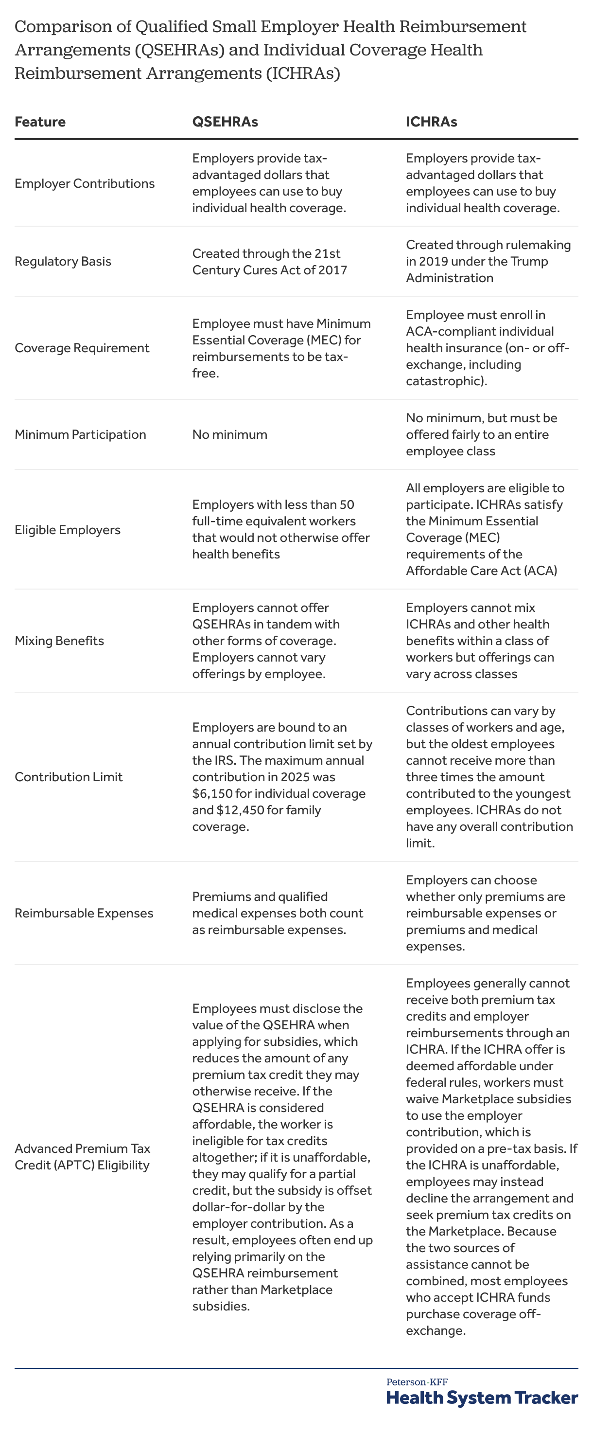 As noted, QSEHRAs are a more limited option, and the rules around them are somewhat complex. Only smaller employers (fewer than 50 full-time equivalent employees) can offer a QSEHRA, though most employers are small enough to do so. Therefore, there is no interaction with the ACA employer shared-responsibility requirements, which only apply to larger firms. Employers offering a QSEHRA must offer it to all full-time employees and cannot offer any other group medical plan to their employees. The amounts that employers can offer employees in a QSEHRA is capped; the limits in 2025 are $6,150 for individual coverage and $12,450 for family coverage. An employee offered a QSEHRA generally remains eligible for ACA premium tax credits, although their tax credit amount is reduced dollar-for-dollar by the amount received through the QSEHRA. Funds received from a QSEHRA by an employee are tax-advantaged provided the employee maintains Minimum Essential Coverage (MEC).