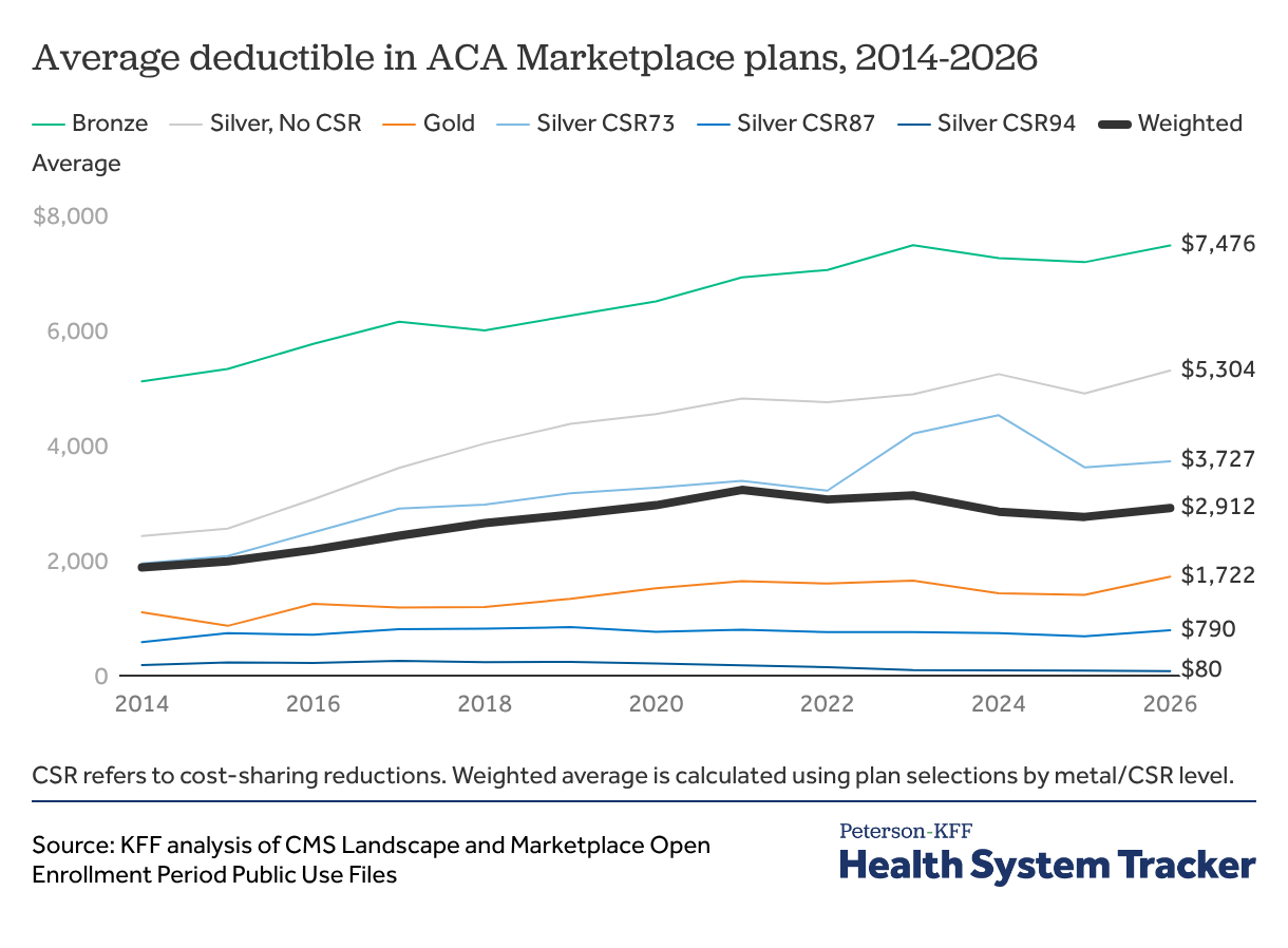 In 2026, the average deductible is $5,304 for a silver plan and $7,186 for a bronze plan. However, cost-sharing reductions (CSRs) decrease the amount of cost sharing (deductibles and copays/coinsurance) individuals must pay when they use care. Enrollees with an income below 250% FPL can receive some level of CSR when they purchase a silver plan, increasing the actuarial value to a level comparable with or better than higher metal levels. Bronze plans are not eligible for CSR. In 2025, 53% of Marketplace enrollees received some form of CSR subsidizing their coverage