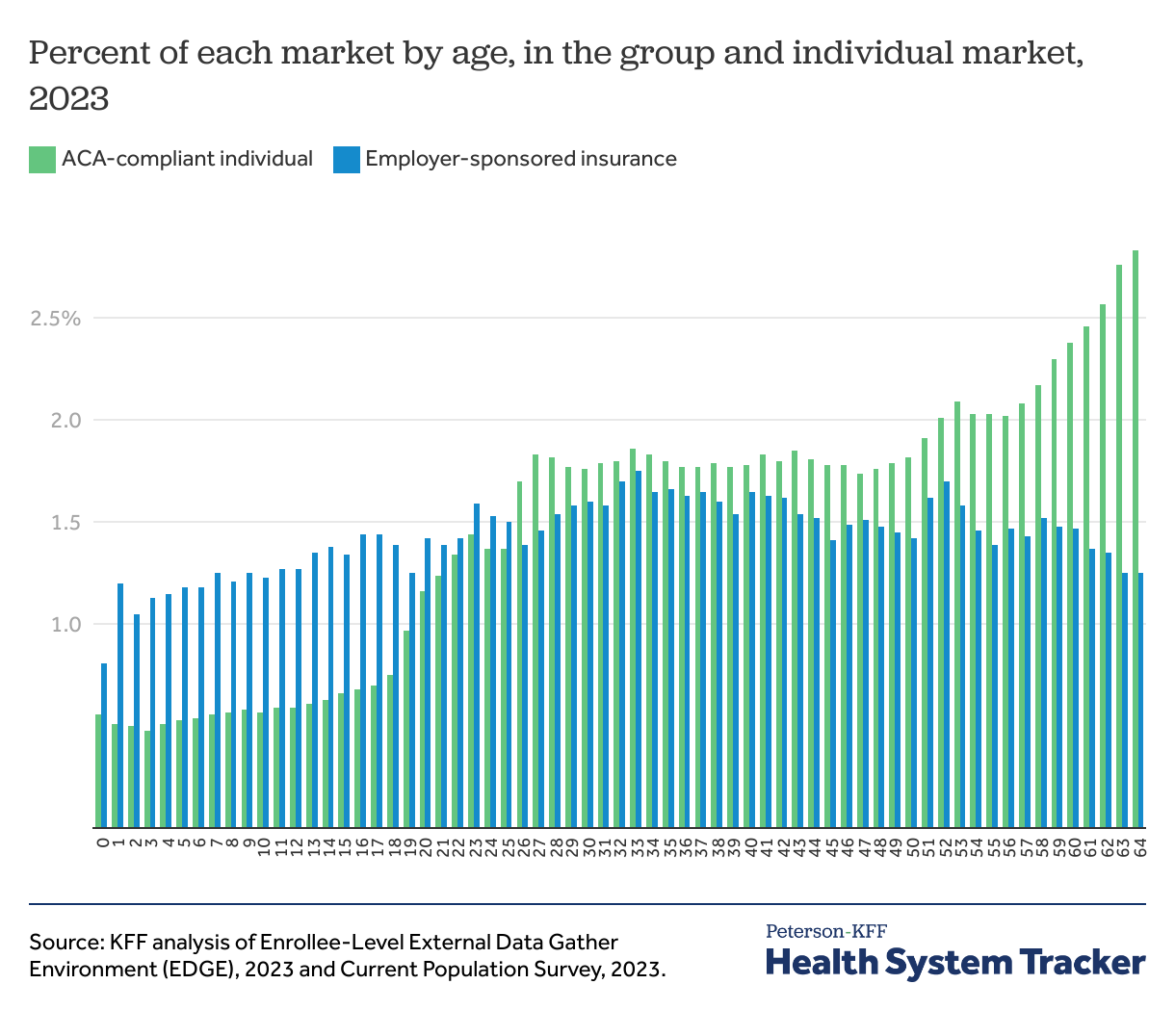 While individual market enrollees tend to have higher deductibles (which would suppress claims and premiums), they are also older (which would increase claims and premiums) on average, compared to people with employer coverage. Older enrollees have higher premiums and claims, and they make up a larger proportion of the individual market compared to the group market. Using 2023 data from the Enrollee-Level External Data Gather Environment (EDGE) for nonelderly enrollees in ACA-compliant individual market, the mean enrollee age is 40, the median age is 41, and the mode or most common age is 64 (as the ACA Marketplace is often a source of coverage for people who are not-quite eligible for Medicare). Using the Current Population Survey, the mean age for nonelderly people with employer-sponsored coverage is 33, the median age is 34, and the mode age is 40. (CPS has a much smaller sample of individual market purchasers than EDGE, but it shows similar patterns for the individual market). See appendix for full age break-down.