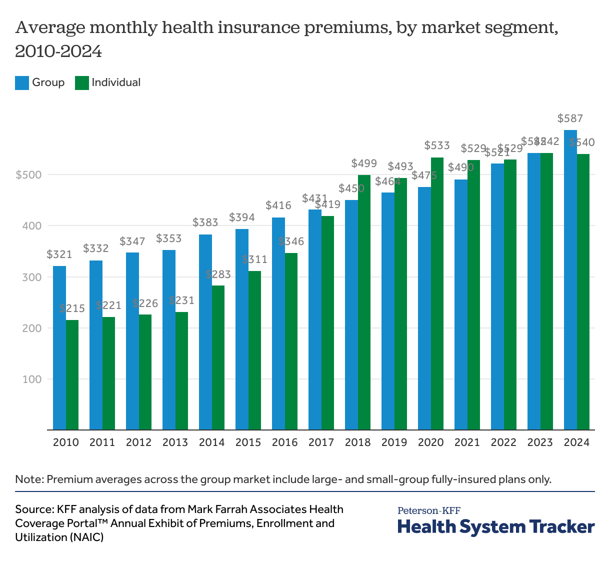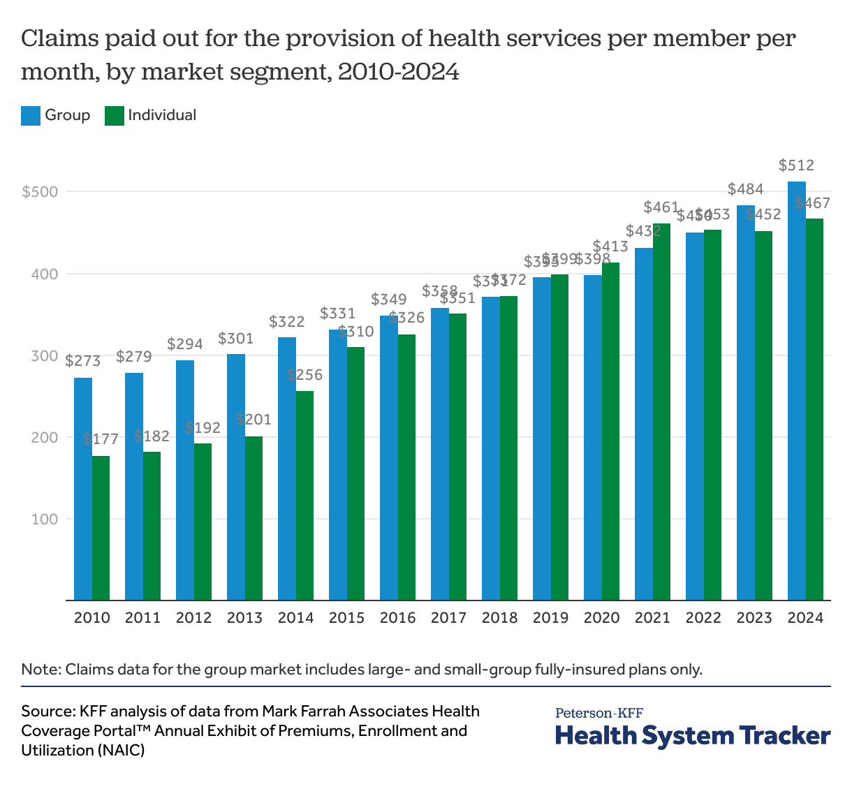 This analysis uses data from Mark Farrah Associates Health Coverage Portal to compare average premiums in the individual and group insurance markets. This data is based on insurer filings to NAIC in the Annual Exhibit of Premiums and Utilization, showing the average premiums and claims per member per month. In this data, the group market includes fully-insured coverage sold to small and large employers, with the majority being smaller employers. The vast majority of individual market coverage is ACA-compliant coverage sold on- and off-exchange, but it also includes some enrollment in non-compliant coverage sold off-exchange (such as short-term limited duration plans).