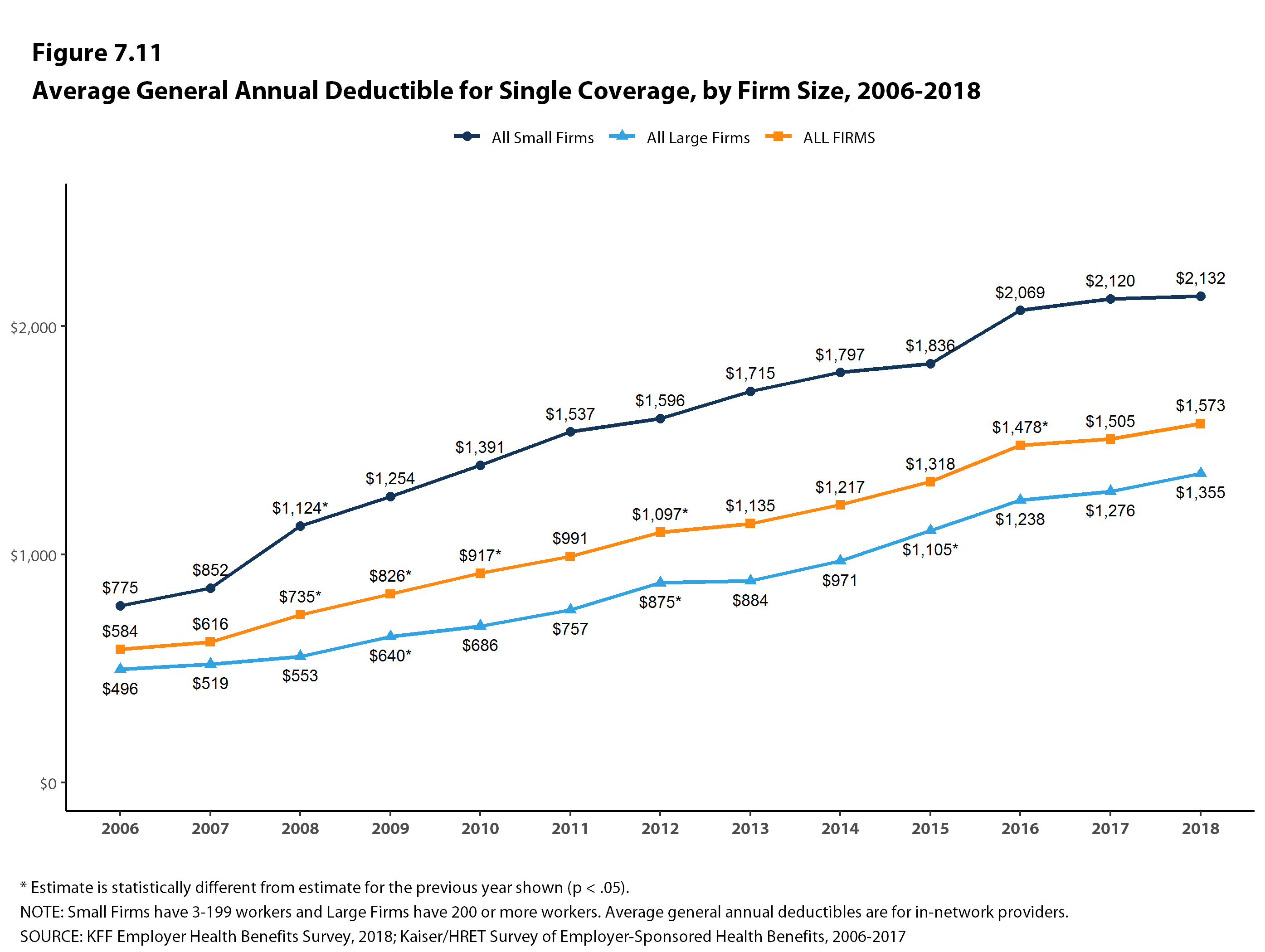 While plans continue to cover a significant share of enrollees’ health costs, out-of-pocket spending for enrollees continues to rise. Over the last ten years, average enrollee out-of-pocket spending has grown 58%, more than double the increase in workers’ wages during the same period. As health spending absorbs a greater portion of household budgets, there are questions about the long-term affordability of some employer plans. Out-of-pocket spending averaged $779 in 2017 compared to $493 in 2007.
