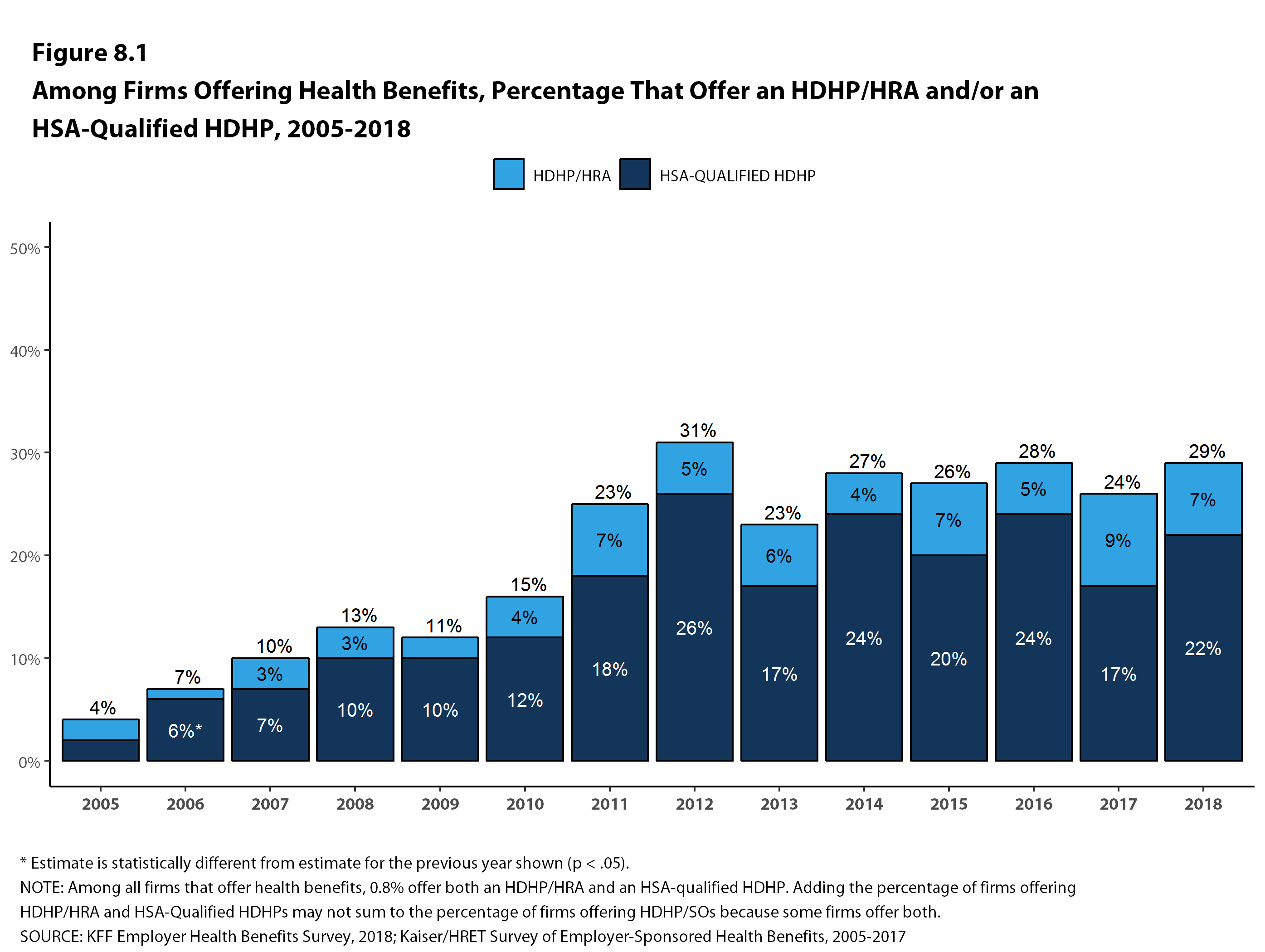 In comparison to cost-sharing, premium contributions are less visible to families and more consistent, usually coming in the form of regular payroll deductions, rather than a payment when a family member needs services. Over the last decade (from 2008 to 2018), the average premium for families with large employer health coverage has increased 55%, and average cost-sharing for a family increased 70%.