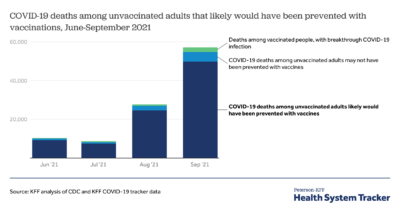 Though there was of course a societal cost to develop and distribute vaccinations, the vaccines save the U.S. health system money in the longer run by preventing costly hospitalizations. (Although the cost of treating COVID-19 patients has an upward effect on health spending and premiums, overall health services utilization and spending have been suppressed during the pandemic due to stay-at-home measures, potential risk of COVID-19 infection at a hospital or doctors’ offices, and concerns over hospital capacity). In addition to preventable direct monetary costs for treatment of unvaccinated people, re-opening of schools and economic recovery also suffers as increasing COVID-19 cases continue to put Americans at risk of avoidable severe illness and even death.