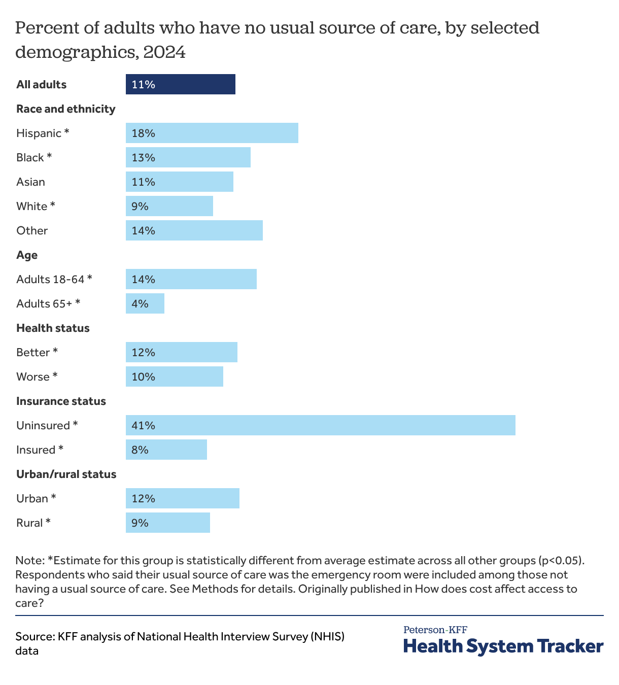 Uninsured adults are about five times as likely to report not having a usual source of care