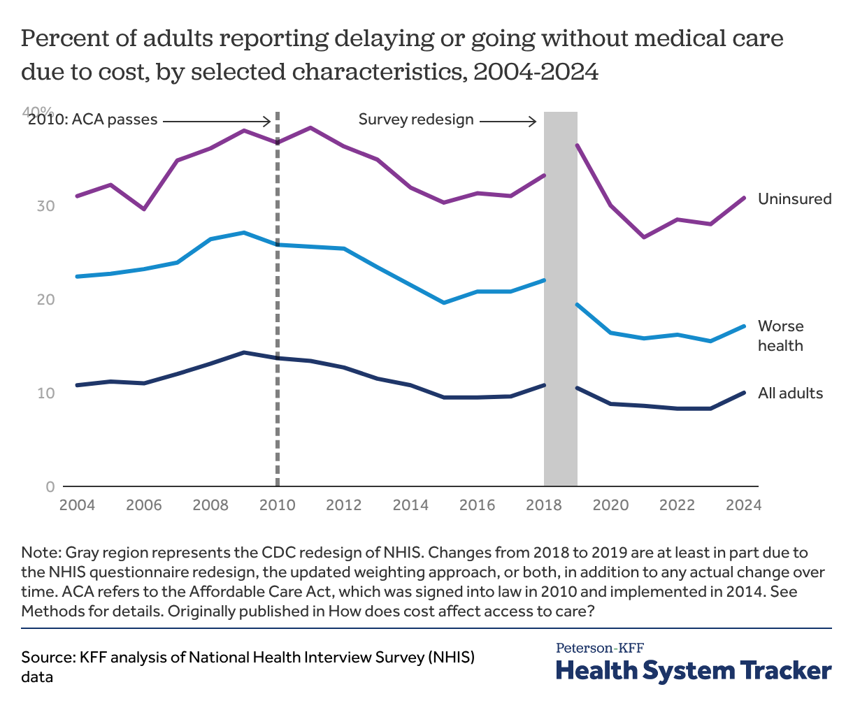Starting with the 2019 NHIS, the U.S. Centers for Disease Control and Prevention (CDC) redesigned the questionnaire and updated the sampling weights methodology. As a result, changes in estimates from 2018 to 2019 cannot be attributed to actual change over time alone, indicated by a shaded gray region in the “Percent of adults reporting delaying or going without medical care due to cost, by selected characteristics, 2004-2024” chart.