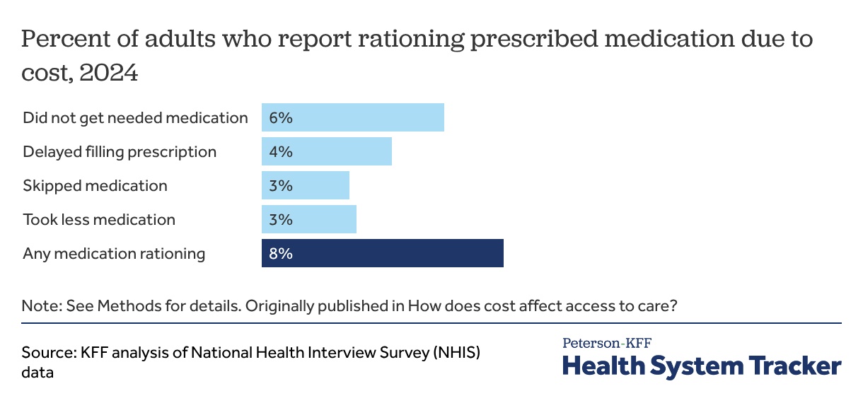 Among all adults, 8% reported rationing prescribed medication due to cost and 6% did not get needed medication to save money. Recent KFF polling found that about a quarter of adults (26%) report that they or someone living with them had problems paying for prescription drugs.