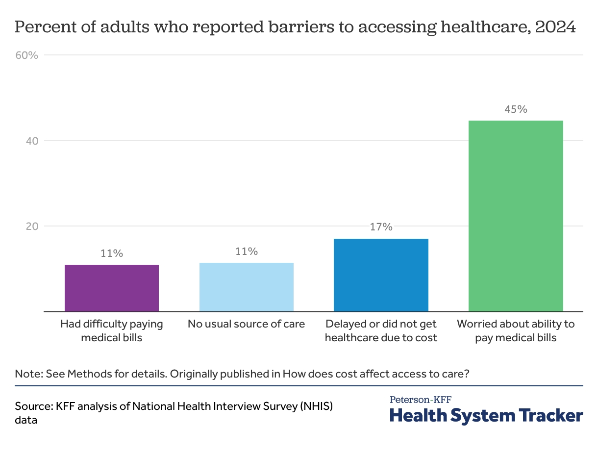 There are many reasons why an individual may choose to delay or forgo healthcare altogether. People without health insurance, for example, are over four times more likely to not have a usual source of care, and this can lead to decreased access to healthcare. In 2024, while similar shares of adults reported that they or a family member had difficulty paying medical bills (11%) or that they did not have a usual source of medical care (11%), almost half (45%) of adults reported that they worried about their ability to pay medical bills if they were to get sick or have an accident.