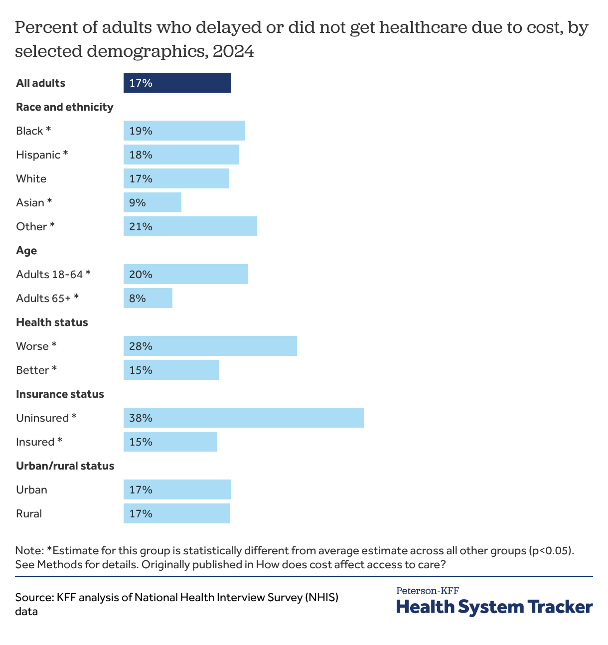 In 2024, about 1 in 6 adults (17%) reported delaying or not getting healthcare due to cost, including those who delayed or did not get medical or mental health care and those who rationed prescription drugs due to cost.
