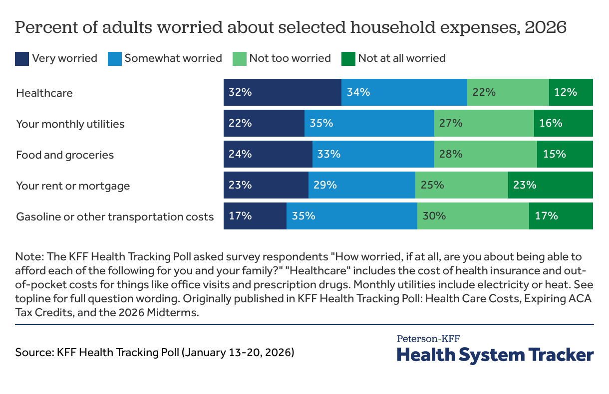 While a smaller portion of America rations healthcare due to cost, concerns about healthcare expenses remain widespread. The January 2026 KFF Health Tracking Poll found that healthcare is the household expense that worries people the most, even more than monthly utilities, food, rent or mortgage, and gasoline or transportation costs. About two-thirds (66%) of adults say they worry about being able to afford healthcare expenses for themselves and their family, including 32% of adults who are very worried and 34% of adults who are somewhat worried.