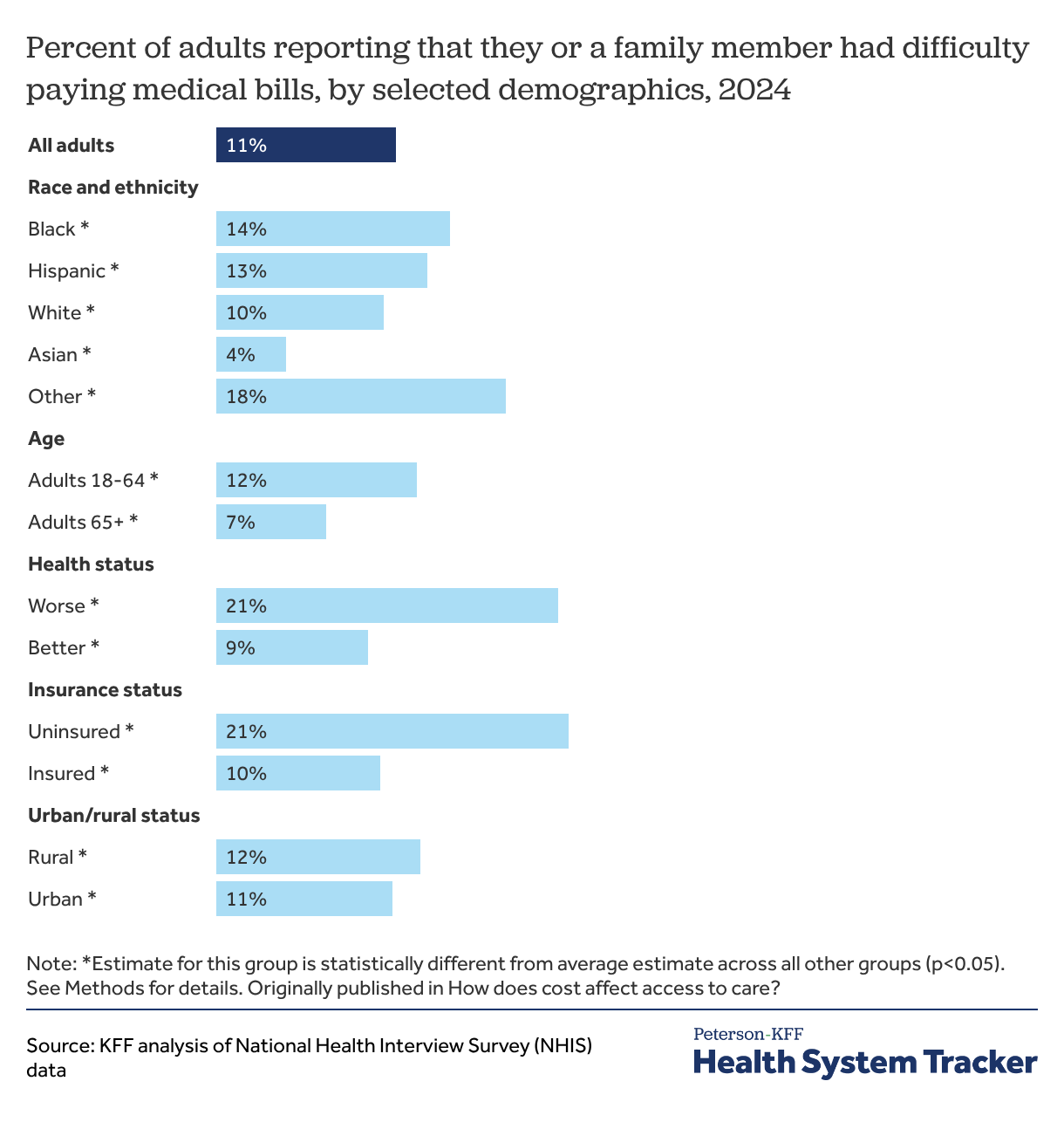 Among all adults, 1 in 9 (11%), including 10% of insured adults, stated that they or a family member had difficulty paying medical bills. This rate is twice as high, over 1 in 5 (21%), for uninsured adults.