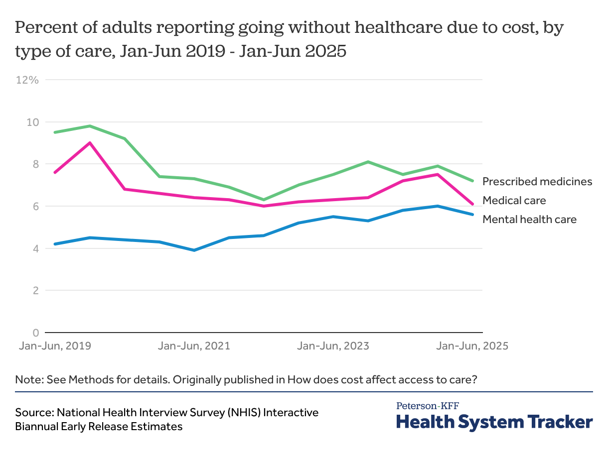 In the first half of 2025, a similar share of adults reported not taking medicine as prescribed (7%), not getting needed medical care (6%), or not getting needed mental health care (6%) due to cost.