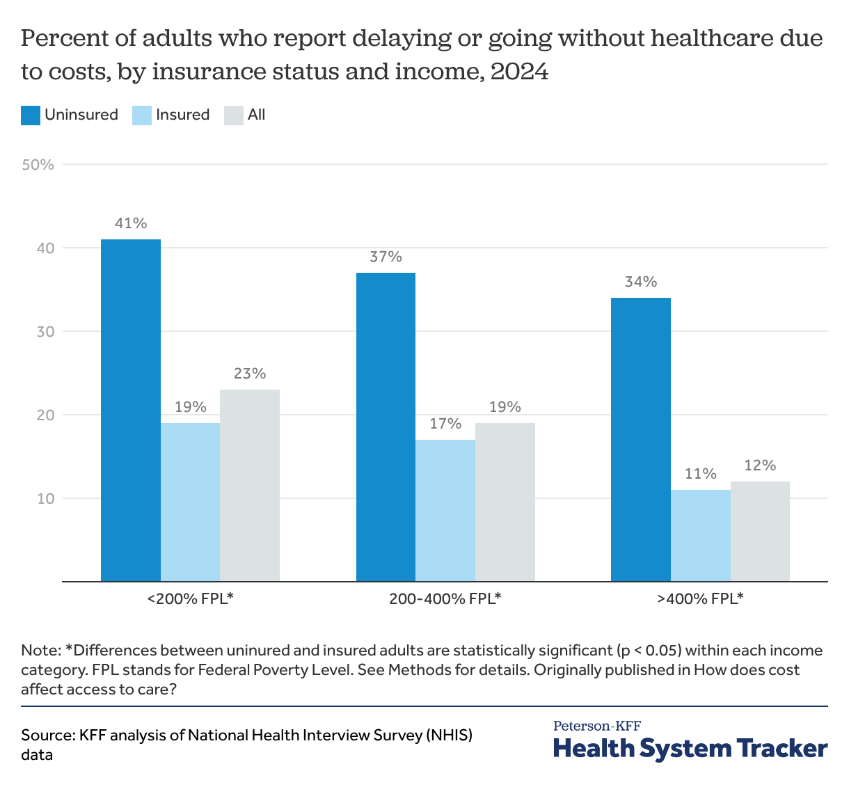 Adults who are uninsured at any point in the year reported delaying or forgoing healthcare due to cost more than twice as often compared to those who are insured (38% versus 15%).