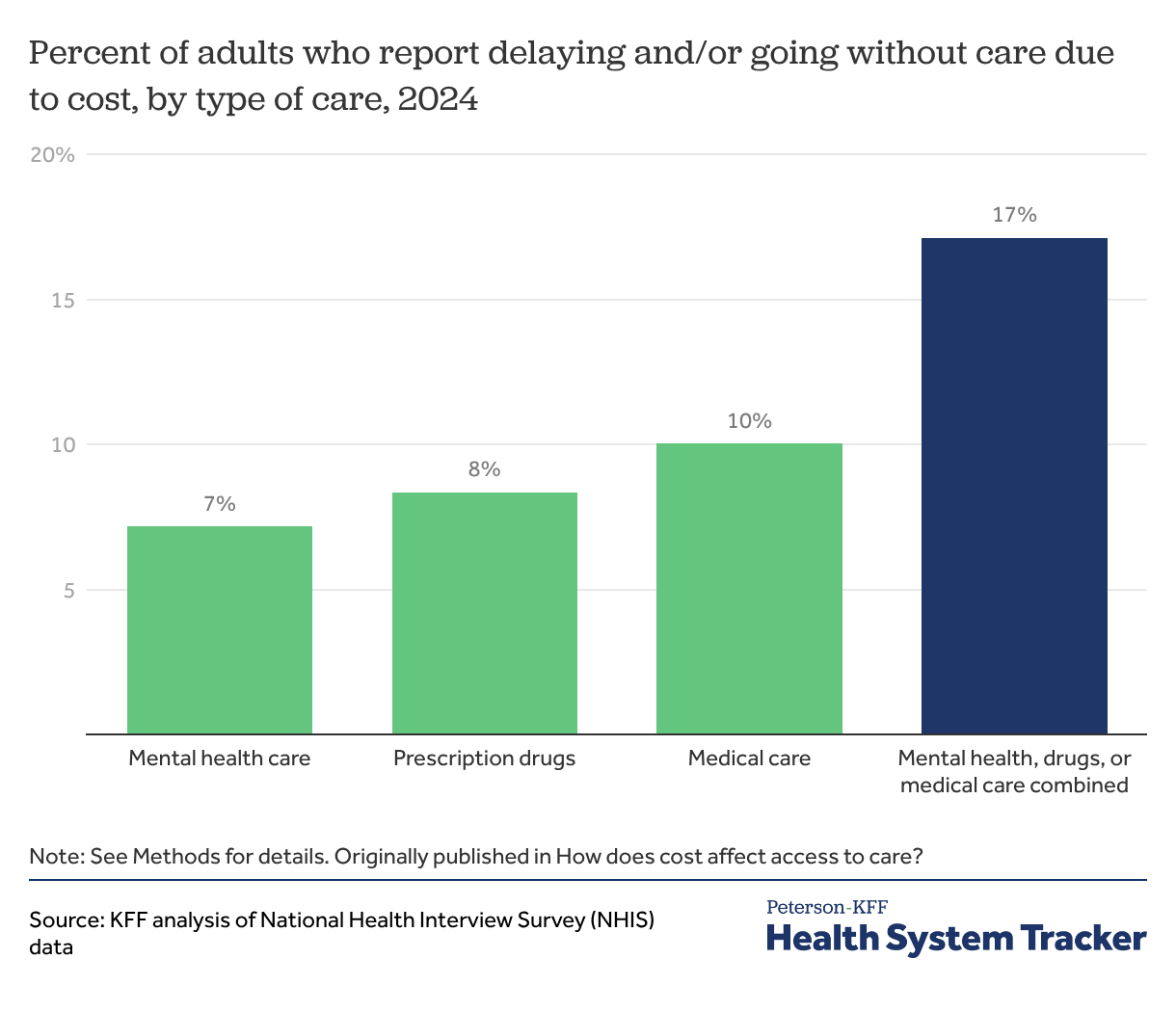 In 2024, about 1 in 6 adults (17%) reported delaying or going without either medical care, prescription drugs, or mental health care due to cost. A similar share of adults reported delaying or going without medical care (10%), prescription drugs (8%), or mental health care (7%) due to cost.