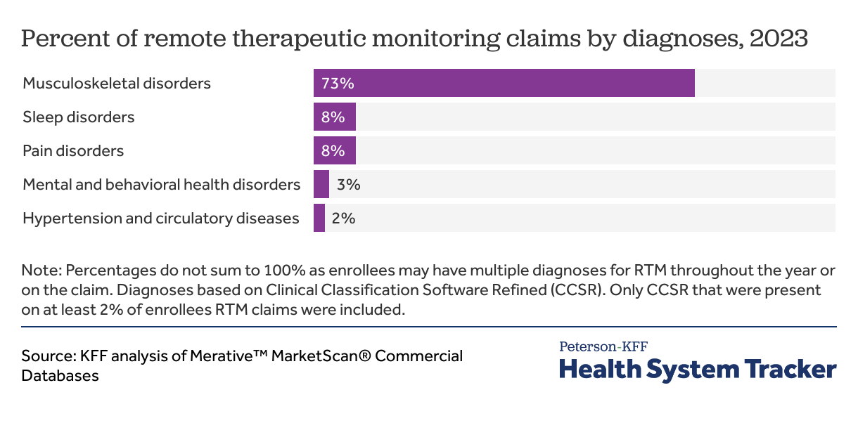 Remote therapeutic monitoring is most often used for musculoskeletal disorders (64%).
