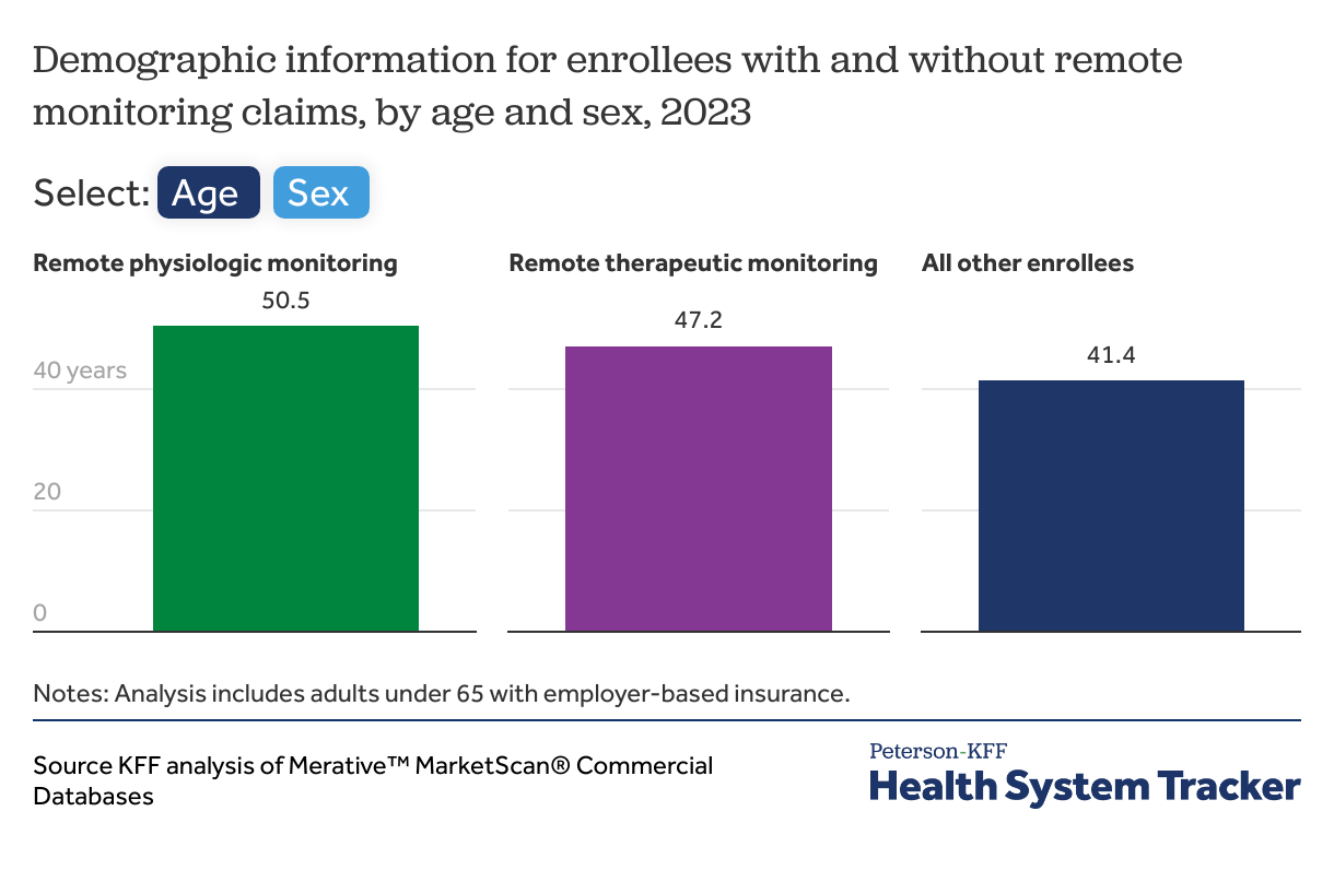 Compared to enrollees who did not use remote monitoring services, those who used remote monitoring were older— with an average age of 51 for RPM and 47 for RTM— compared to 41 for those who did not use these services. Remote monitoring users are also more likely to be female.