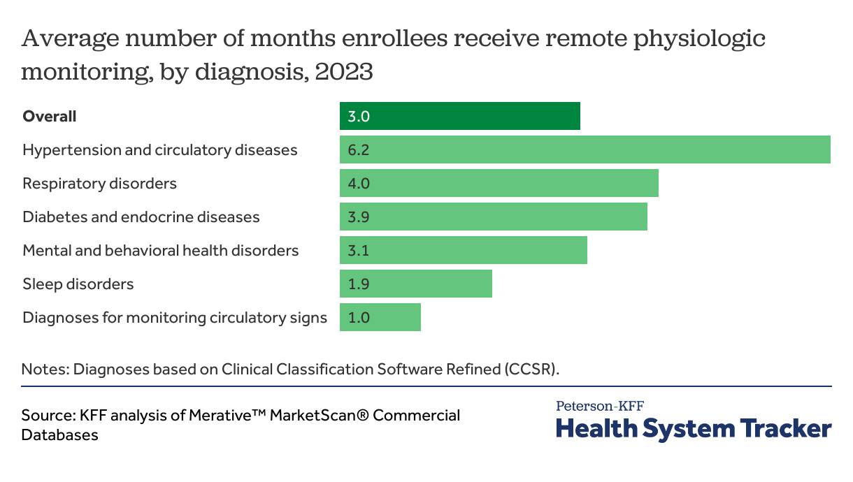 On average, remote physiologic monitoring for hypertension and other circulatory diseases lasts about 6 months. Monitoring for other diagnoses is shorter.
