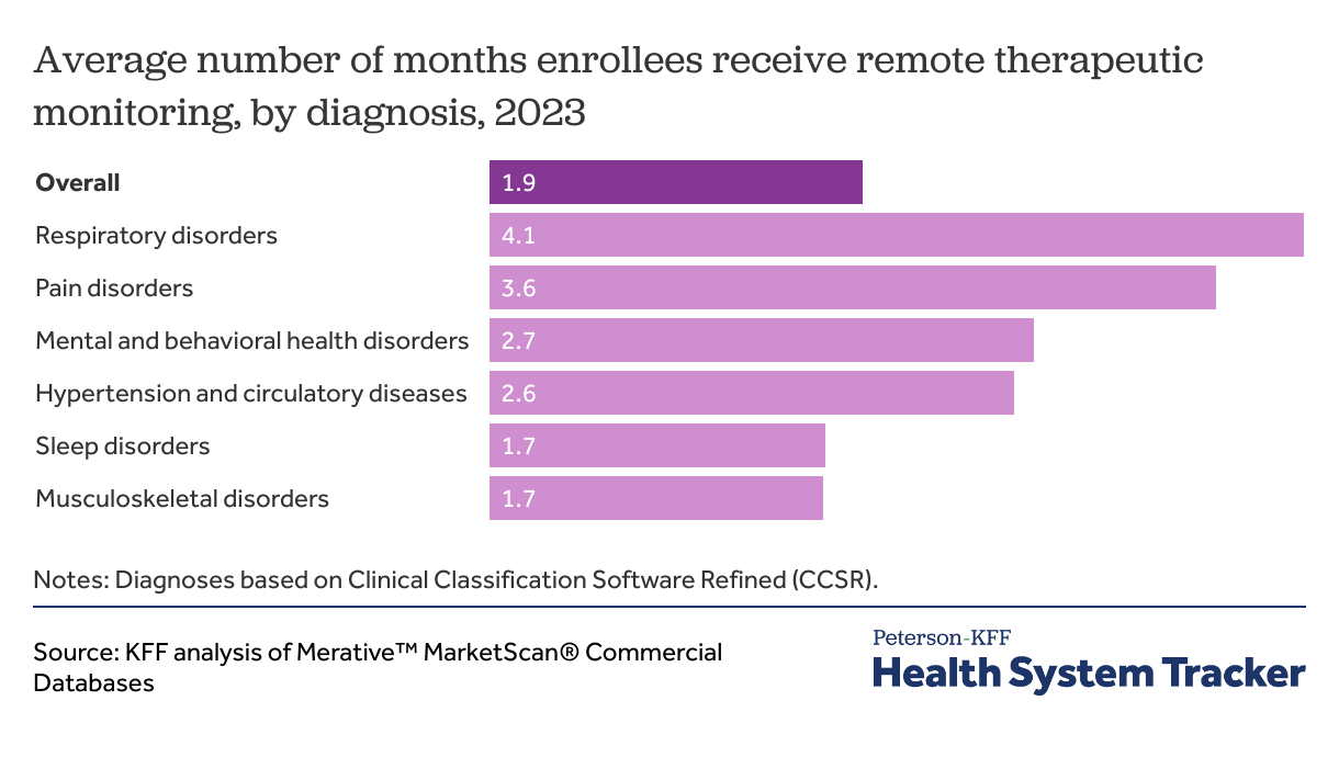 Almost three in four enrollees with RTM used it to monitor musculoskeletal disorders which lasted for an average of 1.7 months. The longest duration was among patients with respiratory disorders, with an average of 4.1 months out of the year, followed by pain disorders averaging 3.6 months in length. Most other diagnoses have shorter treatment, with an average duration across all diagnoses lasting 1.9 months out of the year.