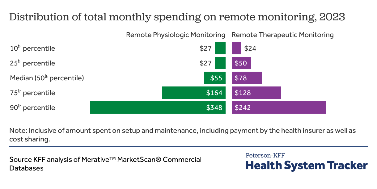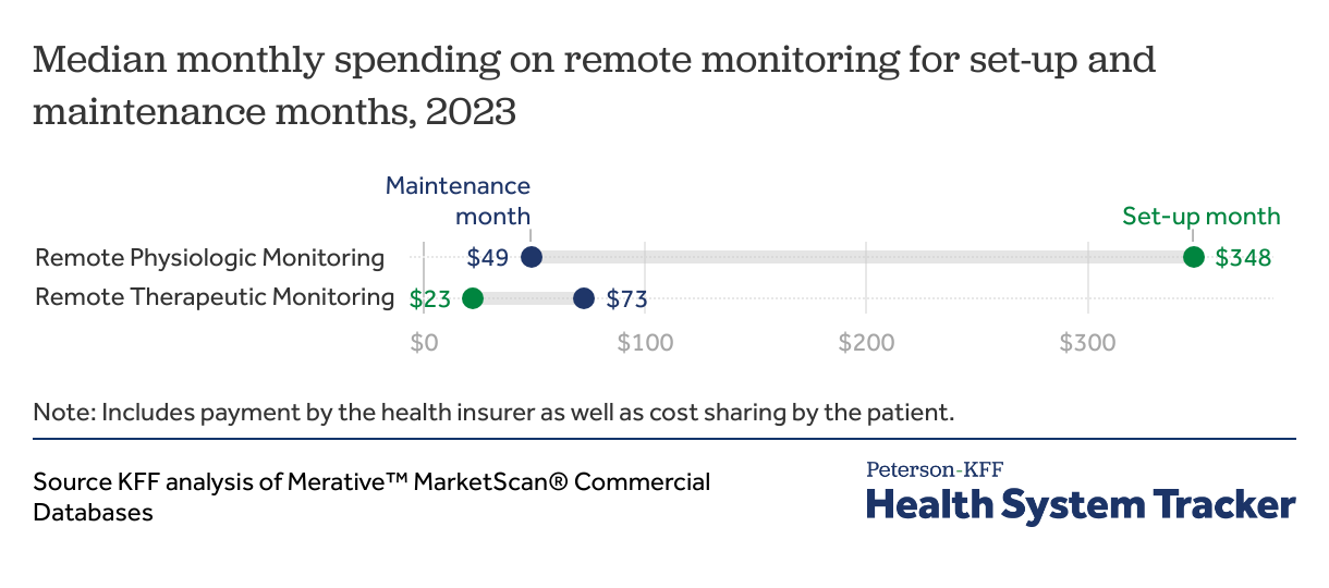 The median total monthly spending per patient is $55 for RPM and is $78 for RTM, though there is variation in how much is paid.