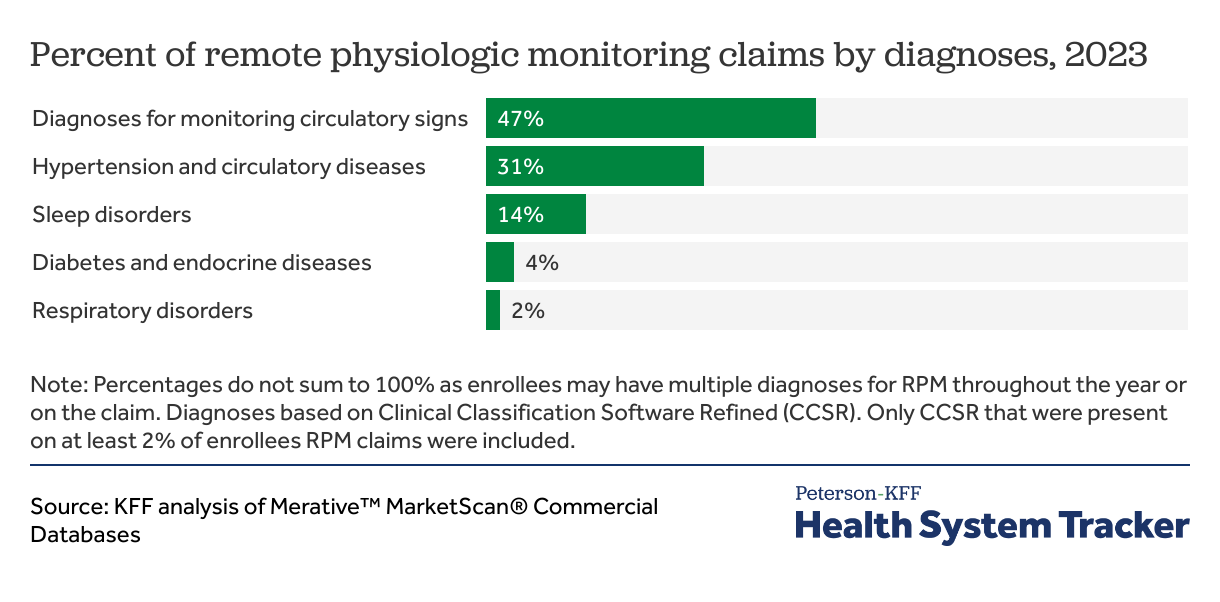 In 2023, an estimated 300,000 adult enrollees with employer-sponsored health insurance received at least one remote monitoring claim, representing 0.3% of all adult enrollees with six or more months of coverage. Of the enrollees with any remote monitoring, 93% had any RPM claims and 19% had any RTM claims. Some enrollees used both RTM and RPM. Enrollees with RPM claims were most likely to have diagnoses monitoring for circulatory conditions (47% of all enrollees with any RPM claims) or treating hypertension and circulatory diseases (31%). Most enrollees with RTM claims had diagnoses for the management of musculoskeletal disorders (73%). Payments for these services vary, with an average monthly cost per patient of $55 for RPM and $78 for RTM.